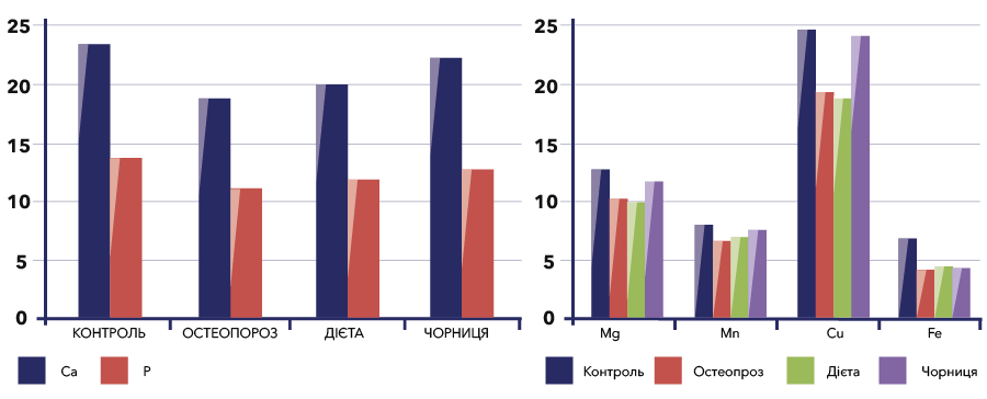 На наведеній нижче діаграмі видно відновлення рівня мікроелементів в кістковій тканині за допомогою чорничної ПАСТИ (IV група). Високий вміст мікроелементів в активній формі в чорничній ПАСТІ призводить до профілактики порушення мінерального гомеостазу і, як наслідок, – попередження розвитку вираженого остеопорозу у експериментальних тварин.