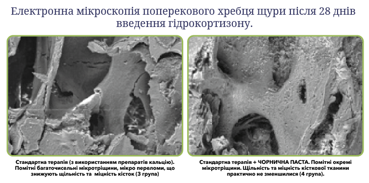 Як показали дослідження, стандартна лікарська терапія ( «невинна» на перший погляд) може в короткі терміни привести до виникнення остеопорозу. Введення в раціон харчування функціонального продукту чорнична ПАСТА істотно збільшує ефективність засвоєння препаратів кальцію, відновлюється практично до здорового рівня макроелементний склад, щільність і міцність кістки.