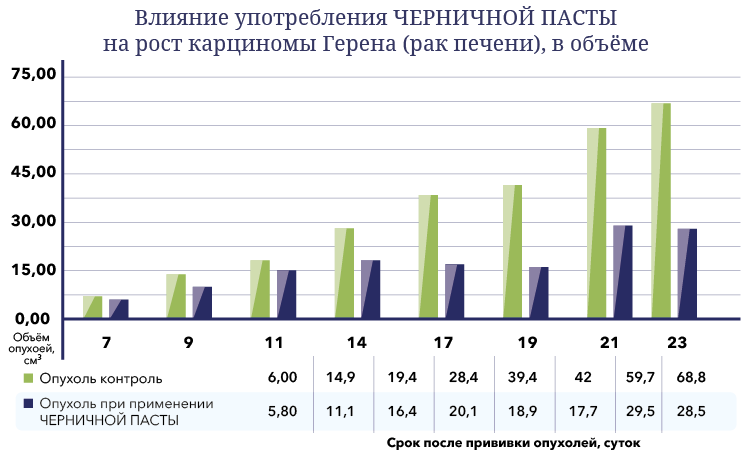 Накопленный практический опыт использования черничной пасты в рационе онкобольных в качестве лечебно-профилактического и поддерживающего питания, показал значительное увеличение стойкости организма. Особенно это заметно после курсов химиотерапии. Первый положительный эффект заметен уже после 2-3 недель приема черничной пасты. Сначала снижается нагрузка на печень, уровень гемоглобина повышается практически до прежней нормы и также восстанавливается формула крови. У пациентов появляются силы и желание бороться со страшным недугом и жить дальше.